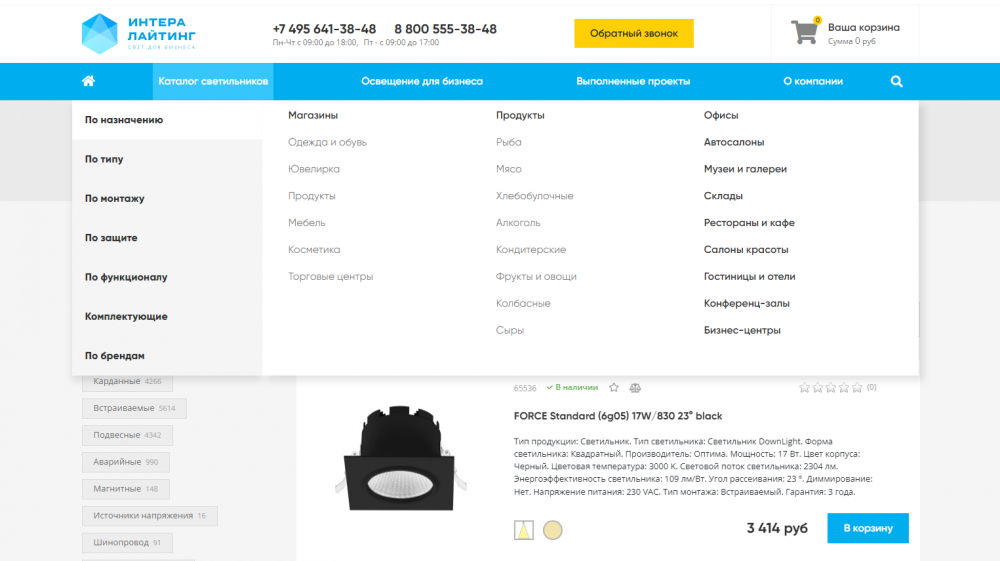 Каталог разбили на категории и подкатегории в соответствии с запросами (модульные светильники / модульные светильники для магазина / модульные светильники для офиса и т.д.)