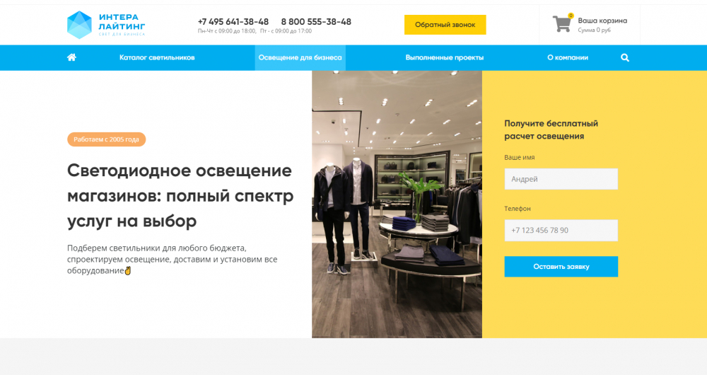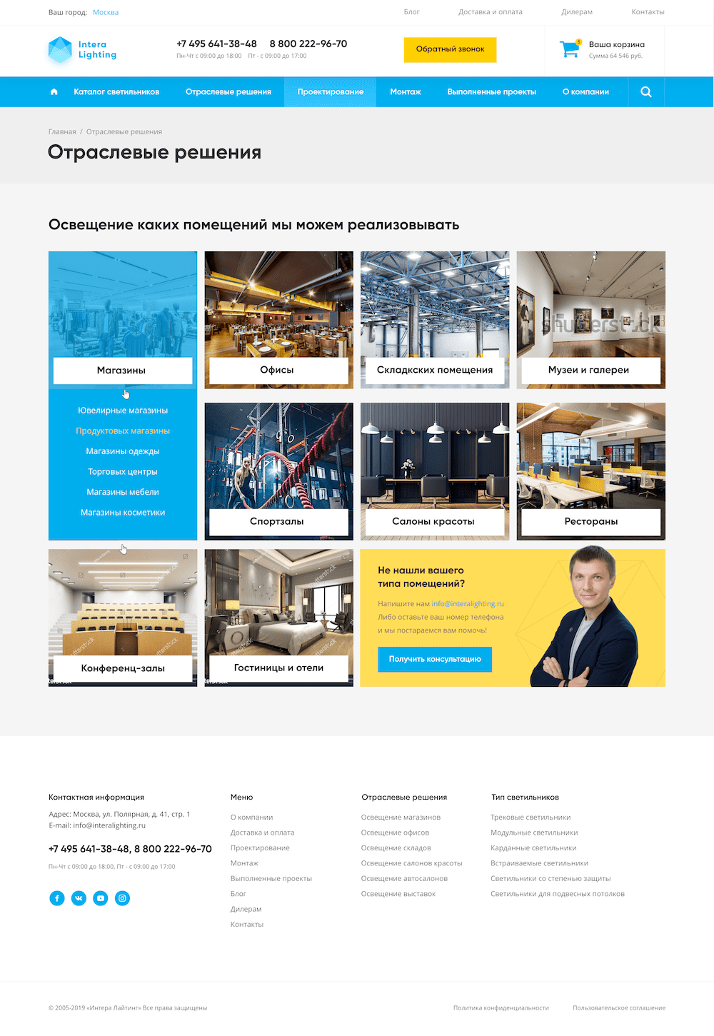 В отраслевых решениях были созданы соответствующие страницы для разных типов бизнеса (освещение для магазина / освещение для офиса / и т.д.). Как выяснилось позже, эти страницы оказались самыми конверсионными. Дальше дожимали их АВ тестированием с помощью Google Optimize.