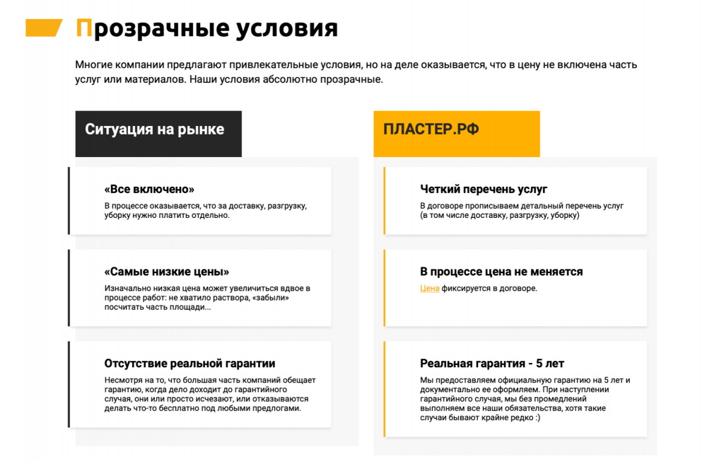 Так посетитель сайта мог самостоятельно рассчитать нужную стоимость работ и понять, из чего она складывается. Дополнительно мы добавили текст, в котором рассказали о ситуации на рынке и несправедливом подходе конкурентов.
