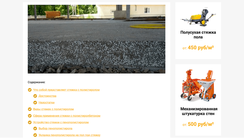 Значительная доля семантического ядра, которую нельзя упускать – это вопросы со словом "цена". Чтобы выйти в ТОП выдачи по запросам вроде «полусухая стяжка цена» или «штукатурка стен сколько стоит за квадратный метр», нужно было указать цены на сайте.